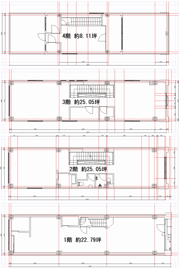- 1階22.79坪+2階25.05坪+3階25.05坪+4階8.11坪=延べ81.02坪